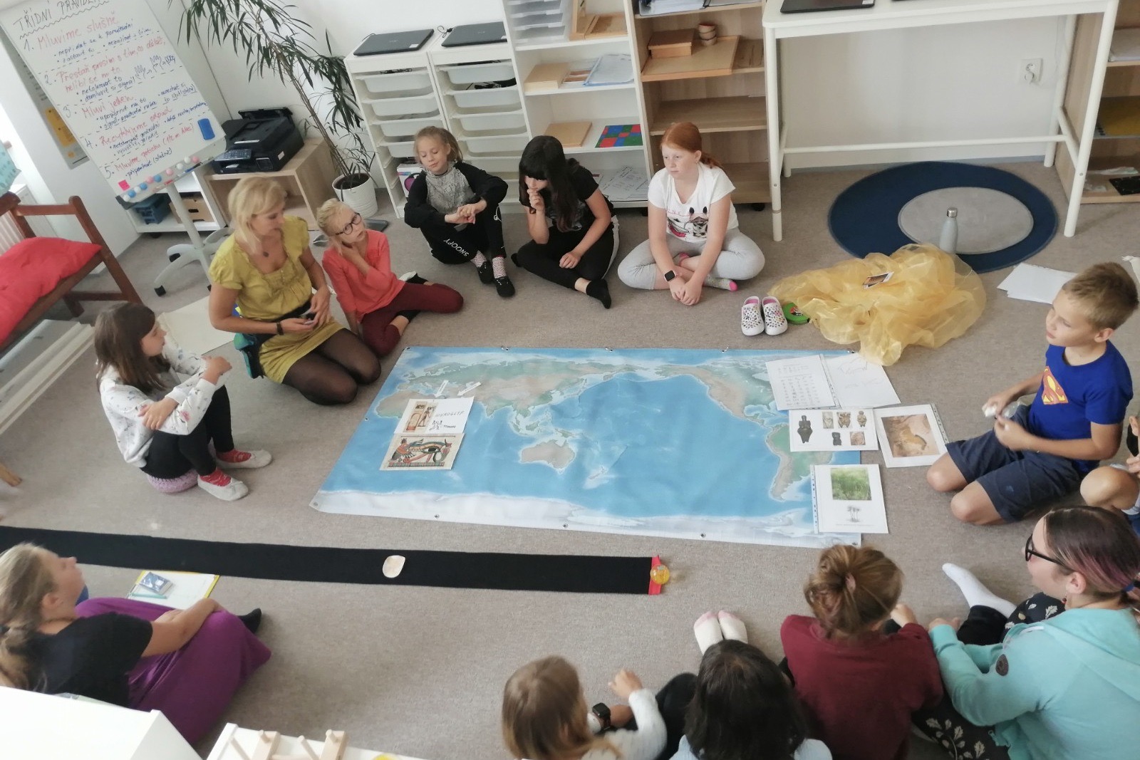 Materiály a pomůcky jsou v nízkých otevřených policích, aby si děti na vše dosáhly samy. Každý den se společně